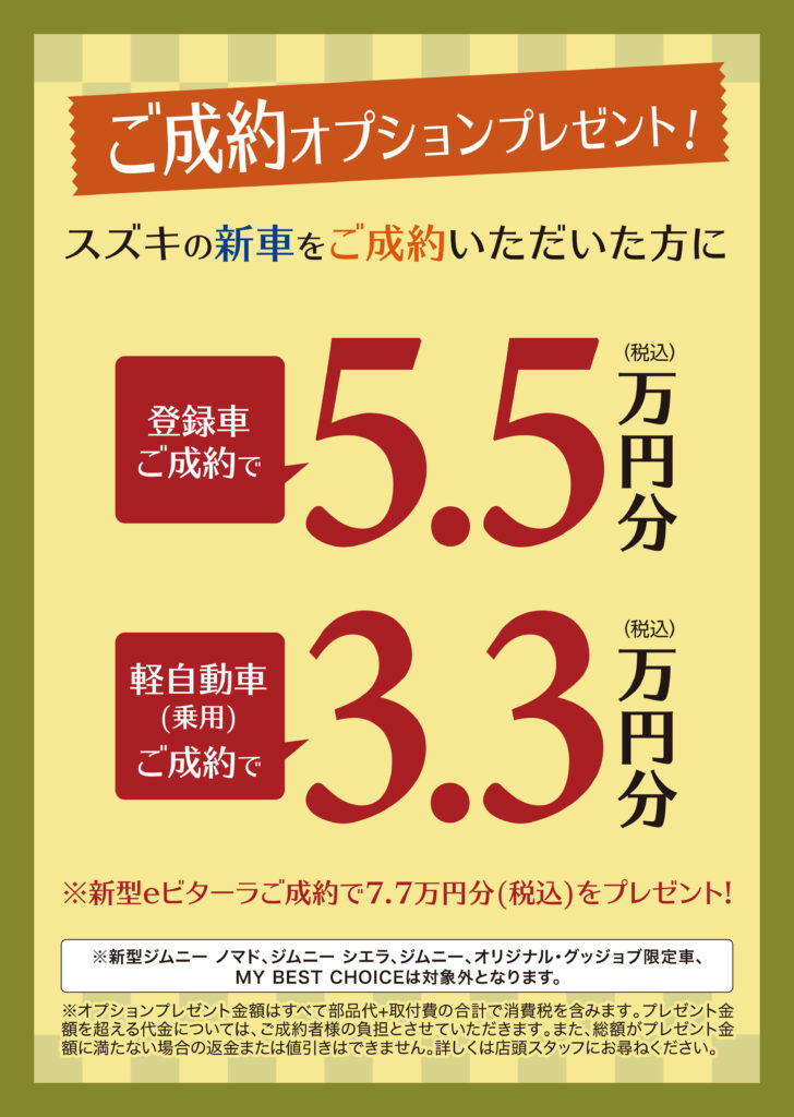 スズキの日 11/7(金)~11/10(月) 開催!! 2025.11.07 今週末は スズキの日!! 開催期間:11/7(金)~11/10(月) 1か月ぶりのスズキの日! お車ご検討中の方、この期間がお得です!! 特典①ご商談プレゼント 特典②ご成約プレゼント 特典③オプションプレゼント ご来店お待ちしております! 来店予約 一覧へもどる 試乗車 フロンクス 本能を刺激するクーペスタイルSUV スペーシア 走れ!かぞく思い。 広々とした 展示車 フロンクス 本能を刺激するクーペスタイルSUV スペーシア 走れ!かぞく思い。 広々とした ハスラー やあ!あたらしい遊べる軽! 今日は何して遊ぼう